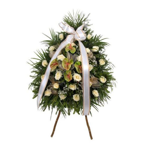 Wieniec pogrzebowy na nóżkach, w skład kompozycji wchodzą białe róże i anturium z dodatkiem liści palmy i gipsówki.