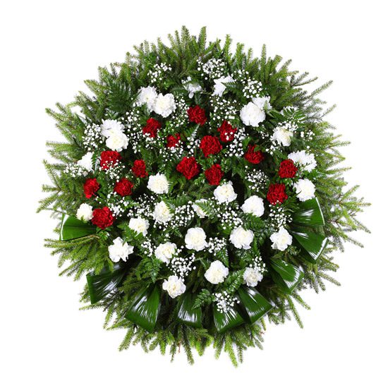 Wienic na obręczy o średnicy 1m, w skład którego wchodzą białe i czerwone goździki z dodatkiem zieleni ozdobnej i gipsówki.