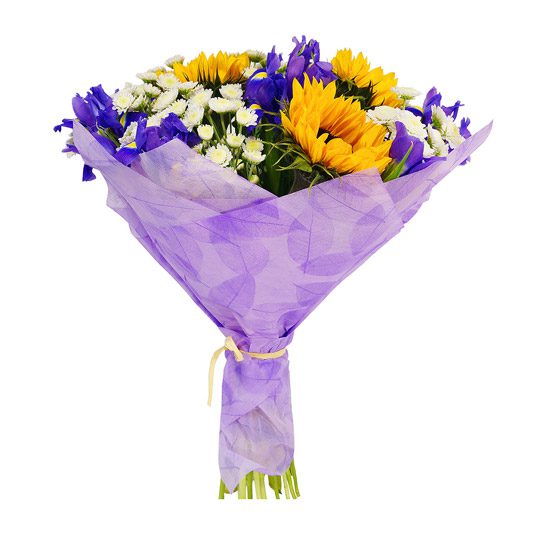 Bukiet składający się ze słoneczników i irysów (sezonowo) lub fioletowej eustomy i białego santini w papierze pod kolor bukietu.