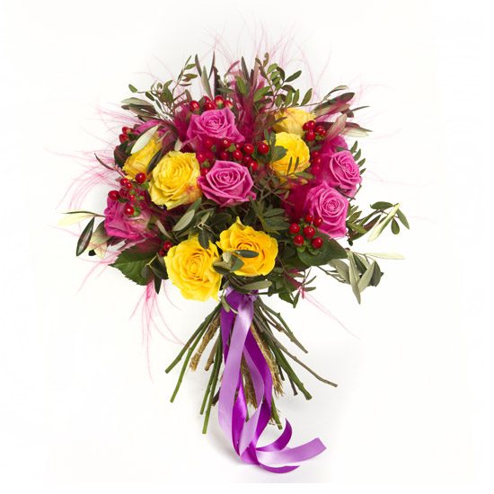 Bukiet róż z dostawą. Bukiet składający się z różowych i żółtych róż w zielonej otulinie z satynową wstążką.
